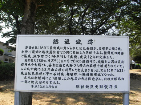 <沿革> 総社城は、関ヶ原の戦いの後に総社1万石を与えられた秋元長朝によって、慶長六年(1601)に築城 が開始された。城は同十五年(1610)に完成した。この間、長朝は総社城の南西の八日市場城を仮の 居所としていた。 長朝は、城の惣堀も兼ねて利根川から天狗岩用水を引き、この事業によって領内の収穫高を大幅に 高めた。長朝の治政は領民に広く受け入れられ、用水や城下町の建設にあたっては領民の助けによる ところも大きかったといわれる。 長朝は寛永五年(1628)に死去し、跡を子の泰朝が継いだが、寛永十年(1633)、泰朝は谷村へ加増 転封となった。これにより総社藩は廃藩となり、総社城も廃城となった。 <手記> 総社城は、利根川の河岸段丘を利用した平城ですが、現在本丸と二の丸の大部分を利根川に削ら れてしまっています。残された二の丸西辺以下も、宅地化により均されてしまっていて、遺構と呼ぶべ きものはほとんどありません。 上図に塗りつぶしで示した遠見山古墳には、その名の通り遠見の櫓があったといわれています。ま た、元景寺と勝山小学校の間を南に走る水路は、往時の外堀の名残です。これら部分的な遺構から、 当時の城域を推測するほかはありません。 上図の丸で示した城川公園の一角に、地元愛好会の設置した案内板があります。 総社城の存在した期間はわずか30年足らずですが、城の北側には戦国期に勝山城があり、植野が 古くから利根川と街道に挟まれた要地であったことが分かります。 |