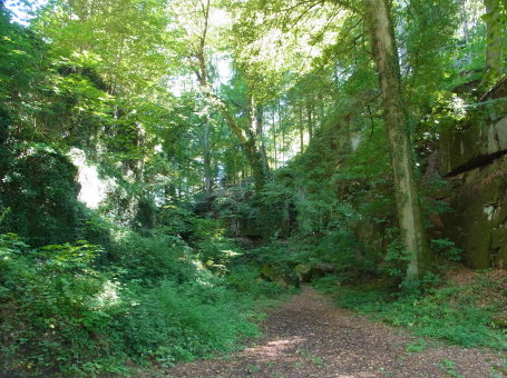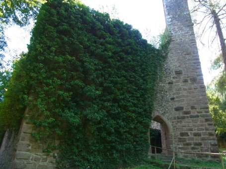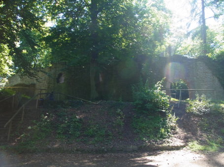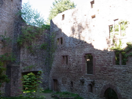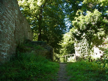 <沿革> 1200年代初頭にホーエンシュタウフェン朝の城として築かれたと考えられている。1284年に ライン宮中伯ルートヴィヒ2世がシュトルツェンエック城を譲り受けたとするのが、史料上の初出 である。 この城に付随する利権や領地はわずかであったため、その後は小領主の間を転々とした。 1504年のランツフート継承戦争で損傷したものとみられ、1509年にはプファルツ選帝侯(かつて のライン宮中伯)より「再築」が指示されている。 1610年に城主家であったフラウエンベルク家が断絶すると、城は再び選帝侯の直轄となった。 このころには、城はかなり老朽化しており、また麓のクレッセルバッハの集落も疫病や貧困に より、わずか1世帯を残すのみとなっていた。シュトルツェンエック城はほどなく廃城となり、、 クレッセルバッハの最後の1家族も、東側にあるツヴィンゲンベルクへ移住することになった。 <手記> シュトルツェンエック城は、ネッカー川が渓谷のように狭まったところに突き出した峰の先端 付近にあります。麓はネッカー沿いのサイクリングロードとなっており、ここから「城(Burg)」と だけ書かれた看板を頼りに山を登って辿りつきます。公共交通機関を利用するならリンダッハ 駅が直線距離では最寄となるのですが、対岸のクレッセルバッハへは渡し船に乗らなければ ならないようです。ただ地図上では渡し船があるように書いてあるのですが、本当にあるのか どうかは定かではありません。 城は主副2つの曲輪からなっています。主郭に大きく分けて2つの建物跡が残っており、この うち西の主塔が1275年、東の壁のみが残る居館跡が1350年に築かれたものだそうです。また 副郭は、1509年の再建時に増築された部分だそうです。副郭には建物はありませんが、井戸 跡と虎口跡が残っています。そのほかに、峰続きの城の裏手を断ち切る堀が残っています。 シュトルツェンエック城はあまりに山深いところにあるため、当初より経営上の利点はほとんど ないといっても過言ではなかったようです。城下集落といえるクレッセルバッハは、川と山肌の 間に家屋を直列させるのがやっとだったろうといった感じで、前述のとおり最終的には放棄され てしまいました。シュトルツェンエック(「誇りの峰」の意味)という立派な名前とは程遠い運命を たどった城といえます。 城跡自体は周辺住民の隠れた憩いの場となっているようで、カップルや子供連れの姿がチラ ホラと見受けられました。ちなみに、クレッセルバッハの集落跡には、今では長屋風の大きな 建物が建っていて、内部はアパートメントホテルと陶器工房となっているようです。 |