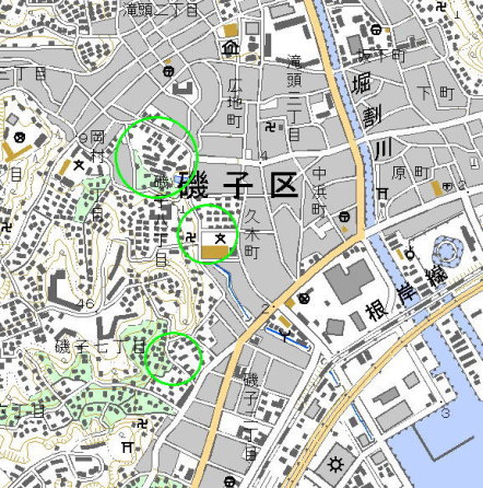 <沿革> 平子氏は、横山党の一流ないし三浦氏一族とみられている。『武蔵七党系図』によれば、 時広の長男広長が平子野内を称したことにはじまるとされる。広長の子に平子有長と石川 経長があるとされ、横山党の本拠である八王子市内に石川や太楽寺といった地名がある ことから、以前は横山党説が有力であった(ただし、太楽寺については所在不明)。しかし、 横山党が壊滅的な打撃を受けた建暦三年(1213)の和田合戦に平子広長の名は現れず、 戦後平子氏が仕置を受けた形跡もない。また有長は、源頼朝に無断で朝廷から任官され たことで、文治元年(1185)に叱責を受けている(『吾妻鏡』)。このことから、有長が源平 合戦に馳せ参じた時広の孫とするのは、年代的に問題があるとする指摘もある(ただし、 あり得ないほどのずれではない)。 三浦氏説は、山形県長井市の平子家に伝わる『(越後)平子氏系図』に依拠している。 それによれば、三浦為通の子三郎次長が久良気氏を名乗り、その曾孫が有長であると いう。その他にも三浦氏流とする系図がいくつか存在する。いずれも為通の子為継の三男 通継にはじまるとしているが、有長までの系譜は明確でない。平子氏の本貫地は久良岐 郡平子郷とされているため、現在では三浦氏説が有力である。 平子郷は現在の南区平楽一帯とされている。平子氏も、「太楽」や「大楽」の苗字で登場 することも少なくなく、「たいらこ」ないし「たいらく」と呼ばれていたとみられている(「平楽」 の読みは「へいらく」)。先の有長は、建久四年(1193)の曽我兄弟の仇討ちの際、最初に 曽我十郎祐成と切り結んだ武士として知られる。『曽我物語』では「武蔵国住人大楽の平 右馬助」と名乗っているが、『吾妻鏡』には「平子野平右馬允」と記されている。同元年 (1190)に頼朝が上洛した際の同行者のなかに「野平右馬允」の名があり、これも有長を 指すと考えられている。 有長の4代末の有氏の代に、平子氏は越後の所領へ下向したとされる。有長の弟経長 の子孫も、越後国山田郷の地頭職を得て下向している。磯子に残った平子氏の動向は 詳らかでない。永享十一年(1439)、永享の乱に敗れて鎌倉公方足利持氏が永安寺に 攻められて自害した際に、最後まで持氏を守って討ち死にした近習のなかに平子因幡守 の名がある。磯子平子氏一族とみられているが、詳細は不明である。 永正九年(1512)、本牧四村を治める平子牛法師丸の名が現れる。これは、後北条氏 から平子氏に与えられた制札にみられるもので、所領を安堵する代わりに北条氏への 服従を要求するものである。しかし、永正が終わる頃には、磯子の平子氏は姿を消して いる。代わって、越後の牛法師右馬允房政・若狭守房長父子が上杉氏重臣として活躍 している。一般に、磯子の牛法師丸と房政ないし房長は同一人物と考えられているが、 確証はない。いずれにせよ、平子氏は永正年間ごろに北条氏によって磯子を逐われた ものと推測されている。 <手記> 平子氏館は、磯子小学校西の真照寺周辺にあったとされています。『武州古文書』の 「平子家譜覚書」には、真照寺の北西に上屋敷が、その南五〜六丁のところに下屋敷 があり、上屋敷背後の腰越山には陣城が設けられていたとあります。当時の真照寺は、 東隣の磯子小学校一帯を含む広大な寺院だったといわれ、その北西にあたる一帯は 寺の墓地となっています。この墓地は東側に対して段差がきつくなっていて、屋敷跡を 利用したものと推測することは十分可能かと思われます。 磯子旧道西側の下屋敷跡と推定されている一帯(地図の下の緑円のあたり)は、今は 新興住宅地となっています。背後は三方を峰に囲まれた館地形となっていて、前方は 旧道越しにすぐ根岸湾に臨んでいたものと思われます。当時は大堀と御影石の石垣に 囲まれていたとも伝えられていますが、遺構はありません。 陣城があったとされる腰越山は、北磯子団地となっています(地図の一番上の緑円 周辺)。山と呼ぶほどの高低差がなく、本当に詰城があったのかと訝っていたところ、 海岸埋め立てのために土取りされて、山は崩されたのだそうです。古地図を見ると、 かつては半独立丘だったことが分かります。 さて、平子氏について一番の論点となっているのは出自の問題です。前述のとおり、 大きく分けて横山党説と三浦氏説があり、現在では後者が有力となっています。前者 を支持する見解においては、「平子野内」や「平子野平」という名乗りが見られることに ついて、「野」の字が横山党の称する小野姓を意味すると考えています。私も、有長や その父広長が称する「野内」「野平」「平(右馬允)」の意味が気になってなりません。 あるいは、「野平」や「平」は小野姓ならびに平姓を表わしているのではないかとも考え ています。思えば、和田合戦で壊滅した横山党が小野姓を名乗る一方、和田義盛は 平姓である三浦氏の一族です。義盛の側室は横山時重の娘と伝わり、平
