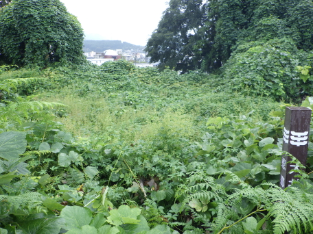 <沿革> 天文年間(1532〜54)に岩村城主遠山景任が大井へ進出した際、その家臣の藤井宗常・常守 兄弟が築いたとされる。宗常は大井城主となったとされることから、鷹撃谷城には常守が入った とも考えられるが、詳細は不明である。 元亀三年(1572)に武田信玄が美濃に進出し、岩村城や大井城が攻め落とされた。鷹撃谷城も このときに落城し、そのまま廃城となったとも推測されるが、確証はない。 <手記> 鷹撃谷城は大井市街の北の阿木川河岸上に築かれた崖端城とみられます。南東に大井城跡 とされる大井小学校があり、街道を挟み込んで相互に補完し合う関係にあったと考えられます。 主郭は畑地だったそうですが、耕作放棄地となってしばらく経っているようで、郭内は夏草の藪 となっていました。主郭の北東辺とみられるラインに土塁状地形があり、その上に「大井城跡」の 標柱が埋もれていました。これは、市の史跡としてはこちらが大井城とされているためで、実際に 史料上の「大井城」がどちらを指しているのか確定をみていないようです。 土塁状地形についても、畑地造成に伴う後世の造作ともいわれていますが、北西辺に見える 空堀は、遺構とみてよいでしょう。また、南東側の線路手前にも空堀状地形が見受けられますが、 すぐ脇まで住宅地となっているので遺構なのかは分かりません。 |