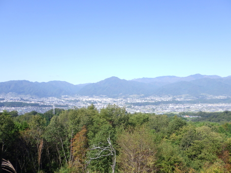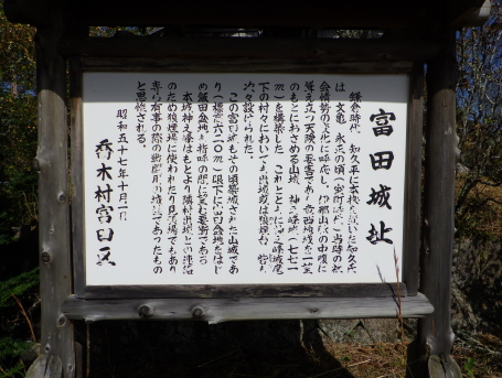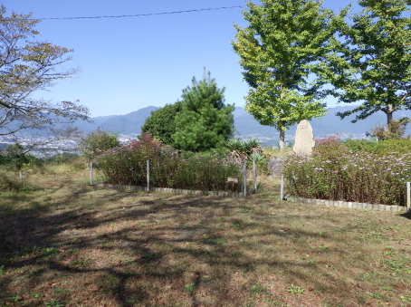 <沿革> 文亀・永正年間(1501~21)に、知久氏家臣・塩沢氏によって築かれたとされる。天文二十三年 (1554)に武田晴信(信玄)が神之峰城を攻略して知久氏が一時滅ぶと、塩沢氏は武田氏に臣従 したとされる。 天正十年(1582)に武田氏が滅び、同年の天正壬午の乱で徳川家康が進出すると、塩沢氏は 徳川氏に従った。同十八年(1590)に徳川家が関東へ移封となると、塩沢氏は帰農したとされる。 したがって、富田城はこのときに廃城となったと推測されるが、確証はない。 <手記> 富田は天竜川支流の富田沢川が形成する擂鉢状の盆地地形の地域で、富田城はその西端の 喉口部を押さえる峰上にあります。城山公園として整備されていて、広い駐車場もあるので訪城は 容易です。 他方で、公園化により遺構はやや不明瞭になっている感があります。主郭には説明板や小社が 建ち、北の尾根筋に2段ほどの腰曲輪跡が見受けられますが、全体像ははっきりしません。また、 南西尾根も平らに均されて遊具が設置されているものの、曲輪跡かは不明です。このほか、主郭 東下に帯曲輪状の、北西尾根にも腰曲輪状の平場が見られます。 城山公園の一番の魅力は、その眺望でしょう。西には伊那平越しに木曽山脈の山々が、東には 富田の集落が見渡せます。とくに富田の盆地は、当時はおそらく比較的生産性の高い地域だった のだろうと思わせる景観でした。 |
