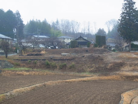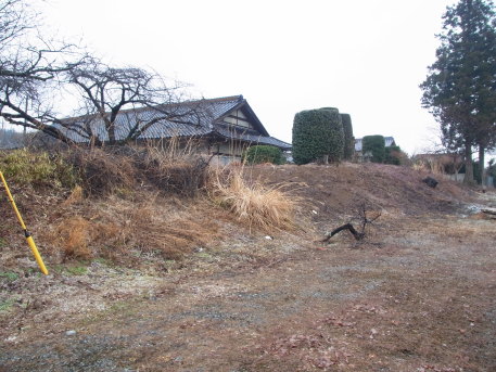 <沿革> 『甲斐国志』に「田中土佐守ノ宅」とある。田中氏については『国志』にも「古事ヲ喪ナヘリ」 とあり、定かでない。 <手記> 花水坂をちょうど上りきったあたりに土塁を備えたお宅があり、これが田中氏屋敷跡です。 かつては西と北の2辺に土塁が残っていたそうですが、道路の拡張により北側は失われて しまいました。また、西辺についてもかつては40mあったということから、いくぶん削られて いるようです。 屋敷は西と南に沢谷戸を望む台地の角に位置しており、在地領主の居館としての立地と 拝察されます。谷戸には今も水田が広がり、花水坂は七里岩台地と甲州街道を結ぶ重要 な街道であったことから、田中氏もそれなりの勢力を有していたものと考えられます。 |
