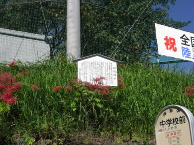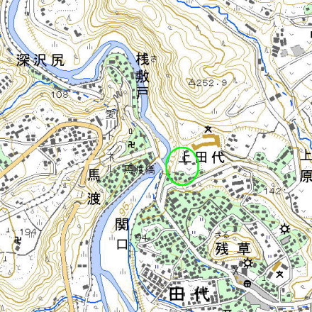 <沿革> 『新編相模国風土記稿』によれば、後北条氏の家臣内藤下野守秀勝によって、 弘治年間(1555〜58)ごろに築かれたとされる。『小田原衆所領役帳』には秀勝の 子の三郎兵衛秀行の名が記されており、少なくとも内藤氏2代が拠っていたものと みられている。 永禄十二年(1569)の武田信玄による小田原攻めとその撤退戦である三増峠の 戦いに際して、田代城は武田勢によって攻め落とされたと伝えられる。その後の 田代城についても不詳である。 <手記> 北から延びる山塊の峰の先端に築かれた城です。西は蛇行する中津川によって 形成された断崖となっていて、南麓には中津川の氾濫原が展開しています。川を 挟んですぐ対岸には細野城があり、2つの城は対となって内藤氏の支配・経略の 拠点となっていたものと思われます。 愛川中学校の西側一帯が城域とされていますが、遺構は明瞭ではありません。 学校の北西隅と川との間あたりがこんもりとした丘となっていて、城内の最高所と 思われます。この丘には、鬼門除けと伝わる八幡社が祭られています。周辺には 「馬場」や「うまや」といった城にまつわる小字が残っているということです。 「合戦みち」に面した中学校の南西隅に説明板がありますが、なぜか読みにくい ことこの上ない位置に立っています。 |