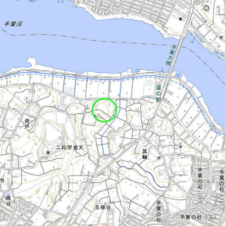 <沿革> 『東葛飾郡誌』には戸張弾正の家臣高城伊勢守の城とある。戸張氏は、千葉氏族 相馬師常の八男行常にはじまるとされるが、戸張弾正なる人物の名は諸系図からは 確認されていない。『本土寺大過去帳』には「長享二年(1488)立沢弾正入道トハリ」 とする記述があり、この立沢弾正と戸張弾正が同一人物であるとも考えられる。立沢 氏はやはり千葉氏庶流で、千葉成胤の三男三谷胤広の子胤義にはじまるとされる。 他方、高城伊勢守なる人物についても定かでない。八千代市の吉橋城主に、高城 伊勢守胤貞の名がみられるが、箕輪城とはかなり離れているため同一人物とは考え にくい。 手賀沼周辺は、戦国時代中期以降には小金城主高城氏の勢力圏に組み込まれて いた。伊勢守についても、この高城氏の一族とみる向きが強い。その場合、伊勢守が 千葉氏庶流とみられる戸張弾正の家臣であったとすることには違和感があり、主従 関係は逆だったのではないかとする説もある。ただし、戸張弾正が立沢弾正であった とすると、その存命期間にあたる15世紀には、まだ高城氏は現在の松戸市内の土豪 程度に過ぎず、戸張氏が高城氏に従わなければならない理由はないといえる。 とはいえ、縄張りの様子から、最終的な改修者が小金城主高城氏であることはほぼ 間違いないものと思われる。 <手記> 箕輪城は、手賀沼に臨む舌状の丘陵群の1つを利用して築かれています。現在、 城跡の大部分は手賀沼病院の敷地となっていますが、建設に先立って発掘調査が 行われ、実測図が残っています。それによると、綺麗な田の字型に曲輪が配置され ており、第一象限から時計回りにT、U、V、W郭と割り振られています。建設され たばかりの頃は、東側先端部に位置するT、U郭が比較的残っていたようですが、 近年こちらにも病院が拡張されたようで、今ではほとんど消滅しています。Google の衛星写真をみると、拡張工事に先立って発掘調査がなされているさまが捉えられ ていました。 辛うじて破壊を免れているのが、U郭の(おそらく)南端部分の空堀と土塁です。 台地の東端付近で、道の南側に、北側の病院敷地より1段低く、地面がむき出しに なっているところがあります。さらに何か建てる予定地だろうかと訝りながらも歩いて みると、その先に見事な堀と土塁が顔を出します。近代的な建物の間から唐突に 出現するので、本当に遺構かどうか一瞬たじろぎましたが、病院に必要な造作とも 思えないので、ようやく城跡らしさにめぐりあえたと小躍りしました。この堀は駐車場 に突き当たって途切れていますが、残っている部分だけでも見ごたえはあるので、 なんとかここだけでも壊さずに保存していただきたいものです。 さて、実測図をみる限り箕輪城の縄張りにはかなりの工夫がみられ、最終的には 戦国時代後期に改修を受けたものと思われます。ただ、手賀の杜ニュータウン付近 にはじまり、箕輪城の東麓で手賀沼に至る沢谷戸は、緩やかで幅が広く、周辺でも それなりに生産性の高い谷戸だったのではないかと思われます。したがって、もと もとは在地領主の居館としてスタートし、勢力を拡大した高城氏に、重要拠点として 目を付けられたものではないかな、と個人的には拝察しています。 |