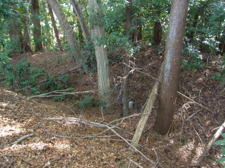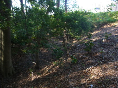 | 空堀周辺を俯瞰する。 曲輪跡として残っているものか。 |