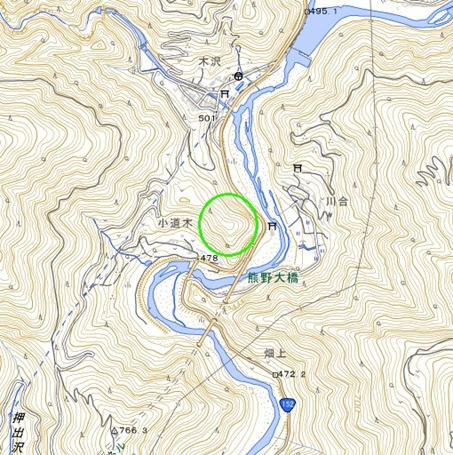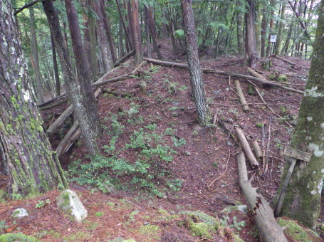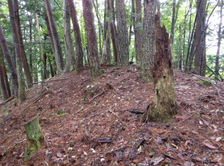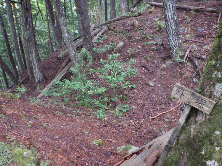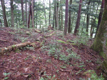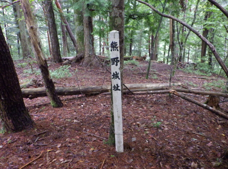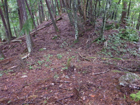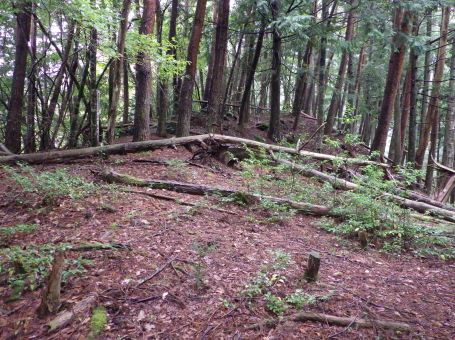 <沿革> 和田城主遠山氏の支城と考えられているが、詳細は不明である。遠山氏が武田氏に降って からは、武田方の狼煙台として使われたといわれる。 <手記> 熊野城は上村川の屈曲部に突き出た峰上の山城です。上図にある通り、後方鞍部を旧秋葉 街道が通過しており、峠に城や街道、百体庚申についての説明板が建っています。その脇から 登って尾根伝いに進めば城内に達しますが、とくに道などはなく、秋口ではシダ藪が茂っていま した。ただ、迷うことはないので己を信じて前進あるのみです。 城は背後に2条の堀切を設け、その先は現地説明板でも『日本城郭大系』でも、2郭から成る としています。第2郭は主郭の堀切側下段にあり、ここには武田信玄の狼煙台に関する説明板 があります。前後2郭というものの曲輪形成はそれほどはっきりしておらず、主郭自体も狼煙台 とみられる頂部の周囲1段下に、帯曲輪および腰曲輪状のスペースが付属しているように見え ました。とはいえこれだけ山奥の城砦ですから、これだけ普請されていれば十分でしょう。 ここからが重要事項ですが、この城はヒルに注意です!!!!訪城を終えて戻り、道の駅の トイレに入ったところで足を見たら、何匹ものヤマビルがえっちらおっちらと足を登ってきている ではありませんか!慌てて個室に駆け込み、トイレットペーパーで次々とつまんで流しました。 雨が降ったり止んだりの天気だったこともありますが、行かれる方は充分にご注意ください^^; |