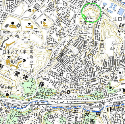 <沿革> 寺尾若狭守の城と伝わるが、詳細は不明である。寺尾城址の南側には、9世紀前後に建てられたと 推定されている八角堂跡があり、寺尾周辺は古くから開発されていたものと考えられる。 寺尾若狭守という人物について、『新編武蔵国風土記稿』には、同じ橘樹郡内の別の寺尾城(現在 の横浜市鶴見区)にあった諏訪右馬助が、入間郡寺尾村にも「居跡」をもっていたからというよく分から ない理由で、この諏訪右馬助の一族ではないかと推測している(しかも、寺尾城は諏訪氏の居城だが、 城主に諏訪右馬助なる人物は確認されていない)。 <手記> 寺尾城は、多摩川沿岸の多摩丘陵の先端にあったとされる城です。東西両脇は深い谷が切り込んで います。西側の馬場谷から登る遊歩道の脇に、まず人の手によるものであろう大きな空堀があります。 上の地図の、寺尾台団地北西脇に示した太線が空堀の位置です。 この空堀に沿って遊歩道を北に進むと、雑木林となっている峰の先端部分を回遊することができます。 全体になだらかな緩斜面になっていますが、よくよく見ると2段程度の削平がなされているように見受け られます。 史料はほとんどなく、遺構も明瞭とはいえませんが、ここに城があったことはおそらく間違いないように 思います。 |