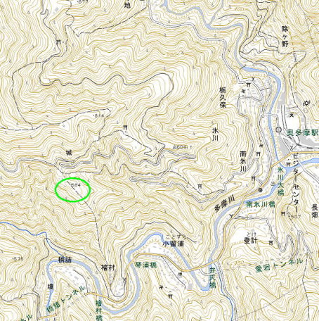 <沿革> 『新編武蔵国風土記稿』の境村と栃久保村の項や、『武蔵名勝図絵』の氷川村の項に 記述があり、平将門の城跡とする伝承が載せられている。また、両書では城の西に位置 する三ノ木戸集落を大手口としている。将門云々とする伝承については、この地方に多く 存在する将門伝説同様、信ずるには及ばないものと思われる。 <手記> その名も奥多摩町氷川字城というところにあり、『日本城郭大系』でも単に「城」として います。ただ、それでは分類上いささか困ってしまうので、ここでは一応栃久保城と仮称 を付けました。とはいえ、今の氷川や栃久保の集落からはだいぶ離れているので、どう 呼んでいいものか判断に窮します。 現在、字城の奥の三ノ木戸まで林道が延びています。ありがたいことに、林道は城跡 をぎりぎり避けて作られていて、道のすぐ下には付け根の堀切や将門神社、井戸跡が 今も残っています。 また堀切の1つ山側にも、切通し状の切れ込みが1本あります。ただ、堀というよりは 峠の旧道といった感じがします。おそらくかつての青梅街道は、上の地図にもある通り 氷川から羽黒三田神社へと登り、城の付け根の峠を越え、三ノ木戸・小中沢を抜けて、 西へ向かっていたものと推測されます。したがって、この城の役目は街道を監視・掌握 することにあったと考えるが妥当でしょう。 堀切から少し尾根先へと下ると、小ピークの広い空間に出ます。ここが主城域と考え られています。削平されているようすはあまりみられないものの、東辺には土塁線が 続いています。さらに土塁線の外側は、人の手で明確に切岸にされています。比定地 には、『大系』によればかつて民家があり、現在も堀切と主郭部の間に墓地や畜舎の 跡などがありますが、この土塁線や切岸が民家に必要であるとは思えず、城郭遺構で あると考えてよいものと思います。南と西の2辺については、ほとんど自然地形のように 見えます。 この城については、『大系』の指摘するとおり三田氏か後北条氏のものとみて間違い ないと思われます。留意すべき点は、土塁が東辺にしか設けられていないというところ です。北条氏の城館とするなら仮想敵は甲斐の武田氏であり、防御も西側に施されて 然るべきでしょう。それが東辺にしかみられないとなると、この城は三田氏が築いたもの で、同氏が滅んだ時点で廃城となったと考えるのが合理的なように感じられます。 |