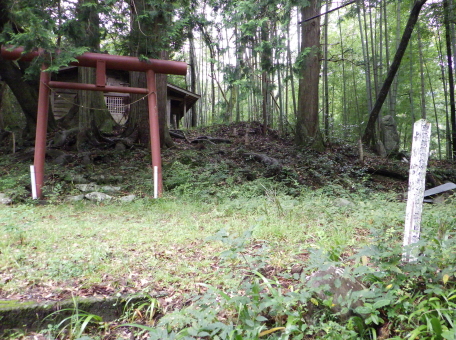 <沿革> 和田城主遠山景広ないしその子・景直の弟・景忠が住したと伝わる。 <手記> 十原館は和田宿南西の遠山川左岸に突出した細峰にあり、対岸には和田城へ移る前の 景広の居城とされる長山城があります。十原の集落から道を下っていくと茶畑があり、その 付け根にはかつて堀切があったそうです。 主郭には城神社が建ち、境内の一角には割れて読みにくくなった館の説明板があります。 境内はそれほど広いとはいえず、居館が置かれていたのはおそらく茶畑のあたりでしょう。 境内の裏手へ下りて峰先側へ進むと、ごく浅い堀切状地形が2か所と、一騎駆けのような 土橋状地形が1か所見受けられ、その先には出郭と思しき削平地もありました。遠山川に 向かって少し離れた位置に出郭があるのは長山城も同様で、両城で川の水運を監視する 意味もあったのかもしれません。 |