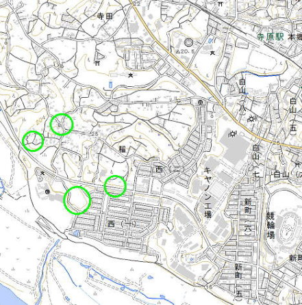 <沿革> 『日本城郭大系』には、高井直将の居城とある。高井氏は下総相馬氏の庶流とされるが、 詳しい系譜は定かでない。直将の子治胤は、宗家相馬整胤を殺害し、永禄九年(1566)に 下剋上により相馬氏の家督を継いだ。『東葛飾郡誌』によれば、直将は整胤と兄弟とある が、治胤と整胤の生年が3年差と近いことと、治胤の妻は整胤の姉ないし妹であることから、 可能性がないわけではないが、信憑性は低いと思われる。 他方、『常総戦蹟』には「稲村城址は北相馬郡稲戸井村大字稲にあり」とあり、稲村城主 を高井直徳としている。永禄四年(1561)に小文間城の一色宮内少輔が大鹿城を攻め落と した際に、兵を出してこれを奪還したのが直徳とされる。直徳と直将の関係は定かでないが、 実際のところ高井氏の居城は高井城にあったと考えられるため、直徳が高井宗家の分家と して稲村にあったとする推測は成り立ち得る。ただし、『常総戦蹟』は明治時代に刊行され た軍記物であり、信憑性にはやはり留保が必要である。 <手記> 私立江戸川学園後背の台地上に城郭関連と思しき地名が散見されることから、稲村城 がこのあたりに存在したのではないかという推測がなされているようですが、遺構などは 発見されておらず、茨城県の遺跡地図でも城跡とは認識されていないようです。 上の地図の右端の緑丸地点に小字「城山」があったそうですが、道路建設によってほぼ 削られているようです。江戸川学園東側に細長く伸びる峰が字「馬場山」で、関連地名の なかではもっとも旧状を残していそうな藪の森ですが、この日は私の訪城では珍しく雨が 降ったため、踏査の困難と時間上の都合から内部には入らず仕舞いでした。 上の地図の左端の緑丸が字「城ノ台」といい、現在は旧家が建っています。一見すると 尾根先の城館地形のようにも見えますが、これはやはり幹線道路の貫通によるもので、 かつてはさらに南の古戸城と峰続きだったようです。残った緑丸は字「城ノ内」で、稲集落 の中心部でもあります。ここにはお社と古木がありますが、やはり城館に関係するような ものは見当たりません。 総じてみると、要害性という点では峰先にあたる「城山」と「馬場山」が城郭地形といえ、 「城ノ台」と「城ノ内」は、存在したとしても居館程度のものが想起されます。4つすべてに またがるような城郭となると、巨城に過ぎてしまうので、ちょっと考えにくいでしょう。 直感的には、稲村城と古戸城が同一のものである可能性は、充分にあると思います。 明確に遺構を残す古戸城と似たような立地の「馬場山」「城山」も、同様に取り立てられて いたのかもしれません。城山はもはや検証不能ですが、馬場山の方は、がんばって踏査 してみれば良かったかなと悔やんでおります。 |