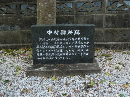 <沿革> 応仁元年(1467)に勃発した応仁の乱を避けて、元関白一条教房が自領のある 土佐国幡多荘に下向すると、土佐国人はこれを迎えいれた。教房は中村に居館を 築き、一条氏は次第に戦国大名化していった。 天正元年(1573)、為松・羽生・安並の三家老は、一条兼定を強制的に隠居させ、 兼定の嫡男内政に家督を継がせた。三家老の専断に不満を抱いた加久見左衛門 ら一条家臣は、中村に攻め入って3氏を滅ぼした。内政の後見であった長宗我部 元親は、これを機に内政の保護を名目に中村に進駐した。内政は大津城へ移され、 兼定は追放された。中村には元親の弟吉良親貞が入ったが、以後の中村御所の 扱いについては定かでない。 天正十七年(1589)の検地帳には、森山の西の「御土居」が「散田」として記載 されている。遅くともこのときまでには、居館としての中村御所は廃されていたもの と推測される。 <手記> 中村御所の構造については必ずしも詳らかではありませんが、一条神社の建つ 森山を中心に、西に御殿、東に政所と寺社を配した南北方向に長い長方形の居館 だったと推定されています。 森山の上には維摩堂があるだけで、城砦化はされていなかったようです。平地は 市街化していて遺構はありませんが、神社参道石段中途を西に入ったところに、 唯一の現存遺構といえる「御化粧の井戸」があります。当時7つあった井戸の1つ で、今も水を湛えています。 また、参道石段下や境内に石碑や説明板があります。 |