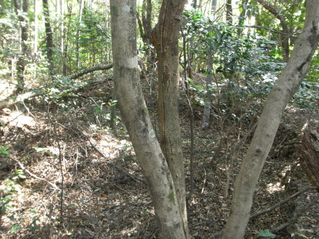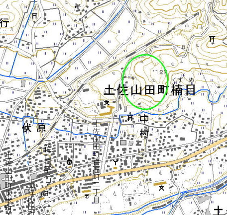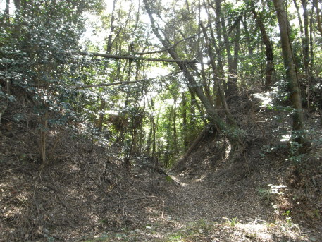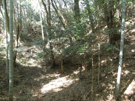<沿革> 甲斐源氏武田信義の嫡男一条忠頼の家臣中原秋家は、建久四年(1193)に香美郡宗我郷と 深淵郷の地頭に任じられた。秋家の主君忠頼が源頼朝の命により暗殺されると、秋家は忠頼の 子秋通を養子として迎え入れた。秋通は、秋家から地頭職を譲り受けて香宗我部氏を名乗り、 秋家は香美郡山田に移って山田氏を称した。山田城は山田氏の居城として築かれたものだが、 いつごろ誰によるものかは詳らかでない。 山田氏は、戦国期に入って土佐七守護の1人に数えられるほどの勢力を保持した。永正五年 (1508)に、山田基通(元義)は本山養明の発起による対長宗我部連合軍に加わり、岡豊城を 攻め落とした。 しかし、長宗我部国親が一条氏の斡旋により岡豊城に返り咲くと、仇敵とばかりに山田氏は 国親の攻勢に晒された。天文十八年(1549)、ついに国親は山田城を襲って落城させた(天文 二十年(1551)とする説もある)。 落城後の山田城および山田氏については伝えられていない。おそらく、そのまま自然廃城と なったものと考えられる。 <手記> 山田城は、物部川が平野部に出る喉口部にあり、眼下を土佐中街道が走っています。城へは、 鏡野中学校直下の十字路を東に向かい、小道をしばらく進むと左手に案内板があるので、そこ から山道を登っていきます。ほかにもルートがあるようですが、この道を行くとまもなく二ノ段下に 着きます。 二ノ段下には、土塁と空堀が比較的良好に残されていて、登城者を圧倒するでしょう。しかし、 二ノ段や詰ノ段に至る道が藪の中で全く分からず、しばらく竹藪をかき分け登ってみたのですが、 途中で断念しました。 今度は西側に向かうと、茶ヶ森と呼ばれる曲輪があります。こちらもとりたてて道らしきものは なかったのですが、意を決して登ってみると、曲輪の東側に大きな堀切が残っていました。また、 茶ヶ森も小さな曲輪ではありますが、周囲を土塁の痕跡と思しき土盛りが巡っていました。 遺構自体はそこかしこに残っているようなので、冬場にもかかわらず登れないというのはかなり 残念に感じました。 |