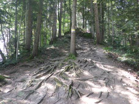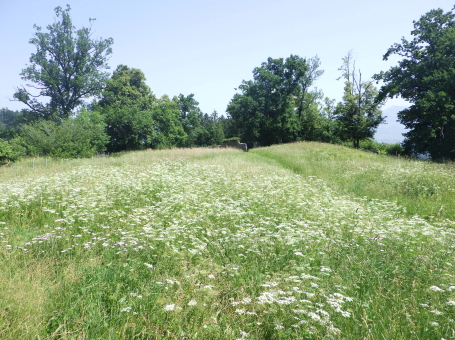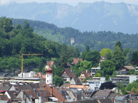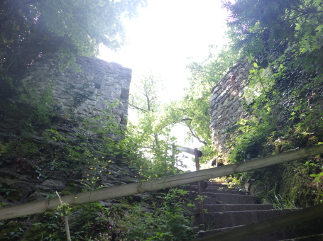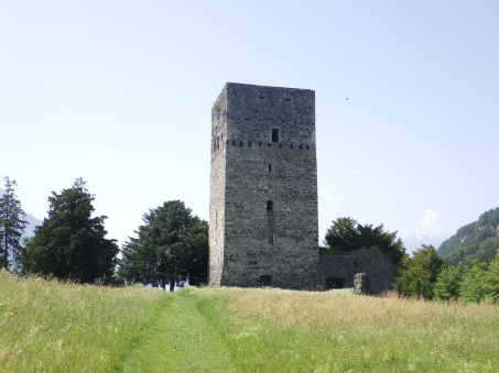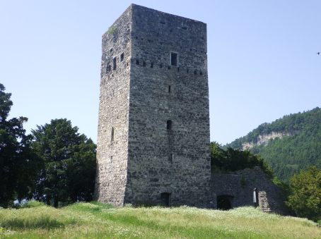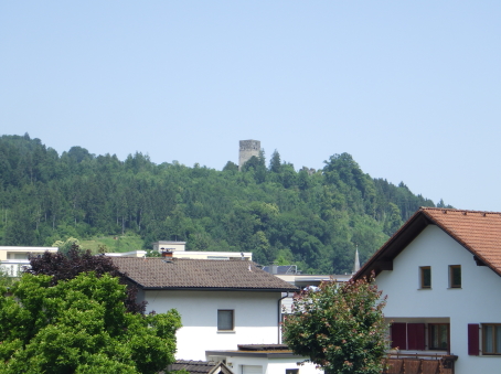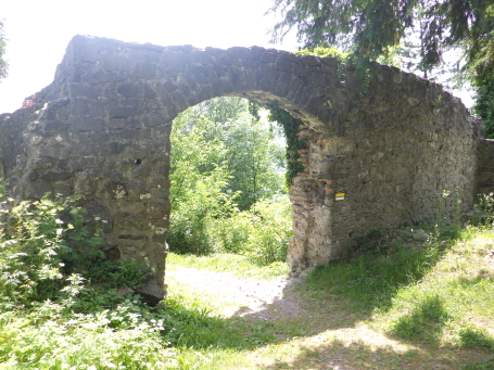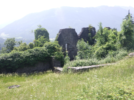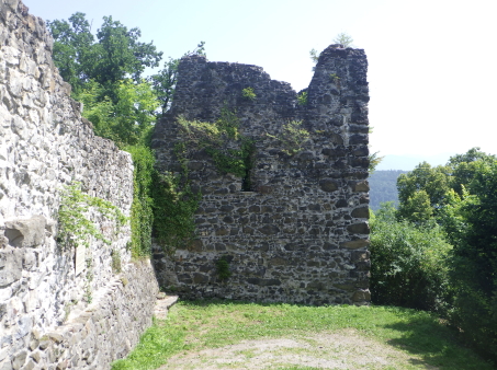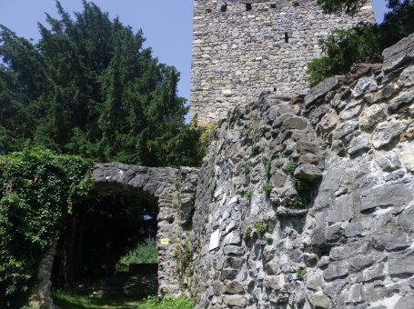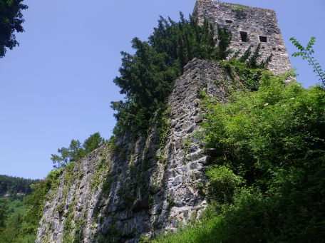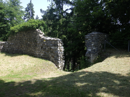 <沿革> モーントフォルト伯フーゴー2世によって1260年ごろ築かれ、その一族が居住したとされる。 1270年にルドルフ・フォン・ハプスブルクがフェルトキルヒとシャッテンブルク城を攻囲すると、 モーントフォルト伯ルドルフ2世は妻をより堅固なトストナー城へ避難させた。 モーントフォルト伯家は多くの系統に分かれたことで知られ、1330年ごろにはフーゴー7世が トストナー(トスタース)を本貫として分家したものの、1359年に無嗣断絶した。城は本家筋の モーントフォルト=フェルトキルヒ伯ルドルフ5世が所有したが、1362年にフュルステンベルク伯 に抵当として譲渡された。1390年までにはハプスブルク家が取得し、フェルトキルヒへ抵当に 入れられている。 1403年、アッペンツェルがザンクト・ガレン修道院からの独立を掲げてアッペンツェル戦争が 勃発すると、フェルトキルヒはアッペンツェルなどの都市が中心となって結成された「越湖同盟 (Bund ob dem See)」に加わった。他方でハプスブルク家は修道院を支援したため、フェルト キルヒ市民軍は1405年にトストナー城を制圧・破壊した。ただ、主塔だけは造りが頑強だった ため倒壊を免れ、城は戦後の1408年に、オーストリア公フリードリヒ4世によって再建された。 しかし、戦争終結によってトストナー城は戦略的価値を失っていたため、1416年には改めて トッゲンブルク伯フリードリヒ7世に抵当として譲り渡され、1436年にフリードリヒ7世が没すると、 再びフェルトキルヒ市の所有となった。 16世紀初めに位置を変えて大手門が新造されたが、その後は多くの貴族の間で所有権を 転々とする抵当の歴史を歩んだ。1616年以降は住む人もなく、城内は荒れるに任せていたと される。 1914年、当時の所有者で、オーストリア=ハンガリー帝国の皇位継承者であったフランツ・ フェルディナントがサラエボで暗殺されると(サラエボ事件)、牧師のヨーゼフ・ホイスレ博士が 城を取得した。博士は1935年にトストナー城をフェルトキルヒ郷土保護協会へ僅か1シリング で売却し(実際にはほぼ寄贈であったとみられる)、史跡として管理されるようになった。 1938~39年にかけて主塔が修築され、1974~80年には全体的な補修・保全が行われ今日 に至っている。 <手記> 現地の説明板ほかではトストナー城(Tostner Burg)となっているものの、地名は一貫して トスタース(Tosters)というようで、城名もトスタース城が正式とみられます。なぜトストナーの 名称が生まれたのかは、調べても分かりませんでした。 城は斜線状に延びる細峰上にあり、シャッテンブルク城からも丘越しに望むことができます。 トスタースの集落側から登山ルートはいくつかあるようですが、登りは峰先側のトスタース・ ブルクヴェークのカーブ付近からがオススメです。縄張り的にはこちらは搦手に当たるようで、 行き着く先の虎口は副門(Nebenaingang)と呼ばれ、現地説明板には「逃走路か?」と付され ていました。 トストナー城は建物のないブルクホーフが広いのが特徴の一つで、主塔や大手郭が南西端、 宮殿が南東隅、そして礼拝堂が北東の副門脇と分散して建っています。また、主塔を除く建物 の規模が比較的小さく、実戦を意識した構造のまま抵当の歴史へと移行したように見受けられ ます。とはいえ、当時の姿がうかがえるのは修復された主塔のみで、残念ながら公開はされて いないようでした。 なお、広い郭内の草っぱらにはマダニが生息しているそうで、SFTS(重症熱性血小板減少 症候群)に感染するおそれはないと思いますが、訪れる際は注意をしましょう。 |
