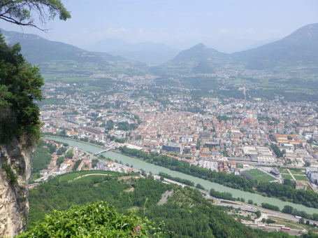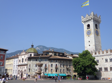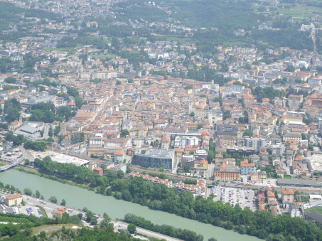 <沿革> トレントの地名は、ケルト語で浅瀬を意味する「Trent」にちなんでいる。ケルト人の集落を 征服したローマは、都市を建設して「トリデントゥム」と名付けたが、ローマ人には「3つの歯」 を意味する名称と認識されていたとされる。 476年に西ローマ帝国が滅亡すると、トレント地域(トレンティーノ)は東ゴート王国、ロンゴ バルド王国、フランク王国、イタリア王国と支配者を変えた後、962年に東フランク王オットー 1世が、イタリア王国を併合して神聖ローマ皇帝に即位した。1027年、皇帝コンラート2世は 世俗権力をトレント司教区に移譲し、トレント司教は宗教権力と世俗権力を合わせ持つ司教 領主となった。 14世紀初頭の司教領主ゲオルク・フォン・リヒテンシュタインは、南はヴェネツィア共和国、 北はチロル伯を兼ねるオーストリア公フリードリヒ4世と対立し、その過程で生じる税負担や 圧政に反発したトレント市民が1407年に大規模な反乱を起こした。ゲオルクはフリードリヒ 4世に救援を要請し、その軍勢によって助け出されたが、ブオンコンシーリョ城に拘留された 後にウィーンへ連行され、いくつかの城を取り上げられた。当時、フリードリヒ4世はローマ 教皇から破門されていたため、ゲオルクは1409年にその解除を条件として解放され、財産 と権利も返還された。 トレント(ドイツ語でトリエント)の名を世界的たらしめたのは、1545~63年に開催された トリエント公会議である。プロテスタントの勃興による宗教改革の機運増大を危惧した教皇 と皇帝を主体として招集された、カトリックの対抗宗教改革の源泉として知られるが、その 会場としてトリエントが選ばれたのは、両者に加えフランスのパワーバランスを考慮しての ものであった。この間に、都市の一部はルネサンス様式に改められたとされる。 スペイン継承戦争中の1703年、トレントはフランス軍に包囲されたが、陥落を免れている。 1796年と翌1797年にはナポレオン麾下のフランス軍に占領されたが、司教領については 維持された。しかし、1803年の「世俗化」によって司教領は帝国領に併合され、750年以上 におよぶ司教領主の支配は終わりを告げた。 <手記> 社会科の教科書にも登場するので知名度は高いトリエント(トレント)ですが、旅の計画を 立てるまでここがそうだとは知りませんでした。南チロルとポー平原の中間のアディジェ川 沿いにあり、両側に1000~2000m級の山々が連なる谷間の街です。中央駅の東側を囲う ように半円形の区画が延びていますが、これは1850年に直線化される前のアディジェ川の 流路で、トレントの旧市街はそのカーブの南外側沖積地に建設されていました。かつての 旧市街北辺は、その名もローマ通りなどとなっています。 トレンド大聖堂および広場のあたりがローマ時代のトリデントゥムの南辺で、その南方の フィエラ広場には中世以降の城壁の一部が残っているそうですが、調べが足りず見逃して しましました。駅南の跨線橋のたもとにはヴァンガ門および城塔が建ち、資料館として公開 されているようですが、私が訪れたときは改修工事か何かで休館中でした。またブオンコン シーリョ城の北西にも、15世紀後半の築というヴェルデ門および城塔が残っています。 時間があれば、ロープウェイでサルダーニャ山へ登るのもおすすめです。旧市街の全景を 一望できる絶景が楽しめるのはもちろん、1935年開通というかなり年代物の索道は、比高 約400m・距離約1kmを途中1本の支柱もなく結んでいて、乗り物好きにはたまらないスリル が味わえます。ちなみに、「Mio Trentino」というアプリを入れて「Trentino Guest Card」を DLすると、なんとそれだけで市内のバスや上述のロープウェイに無料で乗れるほか、各種 割引が受けられます。 |