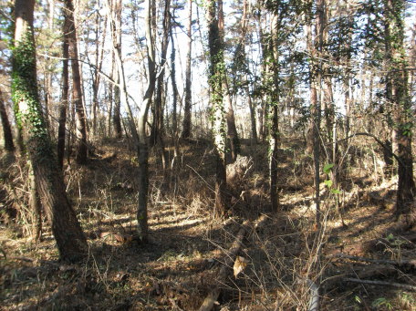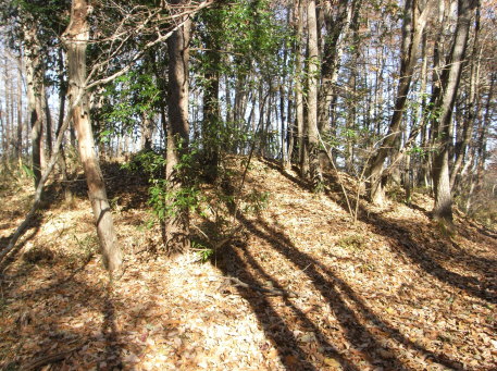 <沿革> 大城、南城とセットで広義の若神子城を形成している。大城は源義光(新羅三郎)によって築かれた との伝説があり、若神子北城の東麓には義光の菩提を弔って建立された正覚寺がある。 一般的には、天正十年(1582)の天正壬午の乱において、北条氏直によって築かれたものと考え られている。旧織田領の空白地帯を巡る争いのなかで、佐久から甲斐へ入った北条軍はが若神子城 に本陣を置いた。約4か月にわたる徳川家康との対峙の末、補給線を絶たれた氏直は和睦を結んで 帰国した。 北条軍の撤収により、若神子北城も廃城となったものと思われる。 <手記> 若神子北城は、若神子大城と西川を挟んだ対岸の丘陵の先端に位置しています。北側の峰続きに テニスクラブがあり、そのコートの南東隅から城跡への道があります。城の南先端から麓へ下りる道も あるようですが、こちらは現在かなり藪に覆われていておすすめできません。 テニスクラブ側から入ると、わりとすぐのところに朽ちかけた城址標柱があります。その近くに、城の 北限の堀と土塁があります。その先は、平坦な藪が延々と続きます。道は城跡の東端に沿って進み ますが、こちら側には土塁や堀などは見受けられません。対して、藪の向こうの西端には、断続的に 土塁が続いています。この土塁は、途中堀などで切れることなく城の西側を囲っており、若神子北城 が細長く広い単郭の城であったことを示しています。 ここから推測されることは、やはり北城が北条軍の陣城として築かれたということです。天正壬午の 乱の際に若神子城に求められたのは、北条軍の本陣としての将兵の駐屯スペースです。おそらくは、 大城だけでは場所が不足したため、北城が追加の陣城として築かれたのでしょう。 |