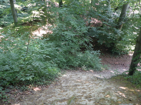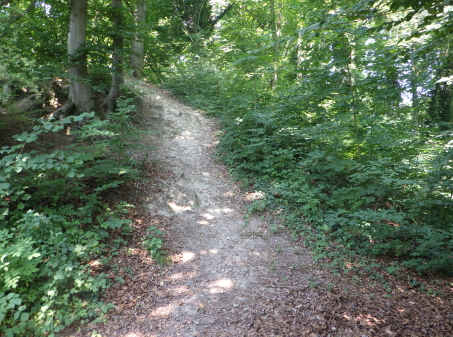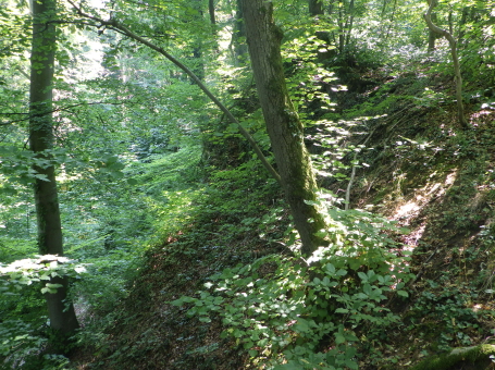 <沿革> 1930年代にホルンフェルゼンの丘で先史時代の墓が発見され、現存する土塁の周辺からも ハルシュタット時代の陶器片が数多く出土したことから、城砦跡として認識されるようになった。 戦後、1940年代末の発掘調査により、先史時代と中世初期のに段階に渡る遺跡であることが 明らかとなった。 21世紀に入っての最近の研究によれば、最初の城砦はハルシュタットB期の紀元前900年 ごろに築かれたと推測されている。城山の東側の尾根に沿って、土塁の上に貝殻性石灰岩と ドロマイトで幅2mの石塁が積まれていたと考えられている。木製の建造物や土塁前方の堀の 存在も想定されたが、その痕跡は検出されなかった。 2つ目の城砦は、紀元後900年前後の建造と推定されている。この新城はかなり急いで建て られたとみられており、旧城の土塁から10mほど東側に深さ4mの堀を穿ち、掘った土を堀沿い に盛り、旧城の土塁との隙間を埋めて新たな城壁とした。このとき、旧城の石塁の石材は他の 用途に転用されたとみられている。また城山の北辺斜面は切岸に削られ、その上にも城壁が 築かれたが、こちらは未完成だったと考えられている。 史料にはみられないため、中世の新城が建設された理由は明らかでない。有力仮説の一つ として、900年ごろからマジャール人がヨーロッパ地域に侵攻するようになり、南西のバーゼル でもバーゼル司教が戦死するほどの被害を受けていることから、バーゼル市民ないし近隣の 住民の避難用として急造された可能性が指摘されている。他方で13世紀以降にバーゼル市が バーゼル司教から独立していくと、さらに前方オーストリア公やハッハベルク=ザウセンベルク 辺境伯らとの間で無用な軋轢を回避するため、交通の要地であるホルンフェルゼンへの築城 を禁止する取り決めがなされたとされる。 近世に入ると、ホルンフェルゼンでは石材や石灰の採掘が盛んとなり、城域の3分の1から 半分ほどが失われ、今日に至っている。 <手記> バーゼル大聖堂裏手のテラスやヴェットシュタイン橋からライン川上流方面を望むと、露岩が 印象的な峰が見えます。これがホルンフェルゼンで、直訳すると角岩といったところです。岩が むき出しなのは上記の採掘の結果であり、かつては川岸まで峰が延びていたはずです。 バーゼルといえばスイス第3の大都市ですが、ホルンフェルゼン付近はそれこそ角のように スイスへ突き出たドイツ領で、露岩上の展望台から見える景色はほぼスイスです。そのため バーゼルから訪城する場合はバスで国境近くまで行き、そこから徒歩で越境します。スイスは EU非加盟ですがシェンゲン協定に加盟しているため、コントロールなどはなく、国境があること すら分からない感じでドイツに入れます。 閑話休題でホルンフェルゼンの展望台から東方へ少し登っていくと、件の土塁が現れます。 土塁といっても上述の通り幅があり、ぱっと見は塚のような感じです。その前方は堀跡という ことですが、こちらも明瞭ではなく、鞍部か窪地のように見えます。土塁は上がると北へ続いて いて、なるほど土塁であることがようやく実感できるでしょう。西麓からホルンフェルゼンへ登る 途中、城山の北辺斜面を窺うとかなりの急斜面に削られており、おそらくこれも未完の城壁が 建っていたという切岸遺構とみてよいかと思います。 このように、ホルンフェルス城は発掘調査に全容解明を委ねなければならない城砦跡遺跡 です。ヨーロッパの城跡というと、基本的には誰かの財産として記録に残るので、史料に全く みられないという例はあるにはありますが、あまり多くはありません。そういった希少性の意味 でも、この城跡は研究者の興味を惹くようです。個人的には、異民族が襲来して「どうしよう!」 「そういえば、誰が作ったか分からない石垣があの山の上にあるぞ!」「よし、それを改築して 逃げ込める城をこさえよう!」みたいな感じだったとすると、日本の掻き上げ城や「村人の城」 論を彷彿とするようで興味深く思います。 |