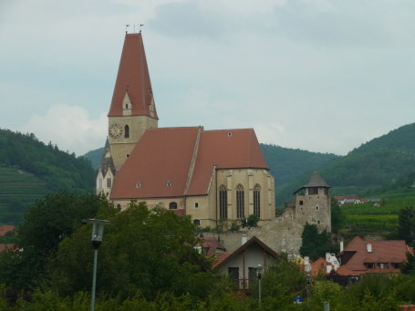 <沿革> ヴァイセンキルヒェン(正式にはヴァイセンキルヒェン・イン・デア・ヴァッハウ(ヴァッハウ渓谷の ヴァイセンキルヒェン))にある聖マリア被昇天教会は、防衛教会(Wehrkirche)と呼ばれる住民 の緊急立て籠もり用の教会で、現在も周囲に城壁が巡っている 教会そのものは、12世紀ごろから存在していたとされるが、1529年の第一次ウィーン包囲で オスマン・トルコの脅威にさらされたことから、翌1530年に住民退避用の防衛教会として城塞化 された。 1683年の第二次ウィーン包囲後の1687年にも、防衛力強化のために改修された。1736~38 年には、教会がバロック様式に改められたが、この頃になると城壁についてはもはや顧みられる ことはなくなったようだ。 <手記> 聖マリア被昇天教会は、のどかなヴァイセンキルヒェンの町で最も大きな建築物であるうえに、 周囲を明らかな城壁で囲まれているので、いささか目立ちます。私は、ヴァッハウ渓谷クルーズ 船のデッキから風景を眺めていたのですが、何やら城っぽい教会があるぞということで何気なく 写真に収めました。後で調べてみると、上記のとおりウィーン包囲によってイスラム帝国の脅威 に晒されたという特殊な事情から築かれた城砦であることが分かり、私の直感もなかなかのもの だと自画自賛するに至りました。ヴァッハウ渓谷には、ほかにも同様の防衛教会がいくつかみら れました。 船の上から眺めただけなので詳しいことは分かりませんが、なかなか立派で古い城壁だけで なく、教会自体も由緒のあるもののようで、この町で目玉スポットの1つになっているようです。 それにしても、防衛教会とは日本の本願寺などの城塞寺院のようで面白いと感じました。日本 の寺院は緊急時に住民を収容してくれたのかな?などと疑問にも思ったり。 |