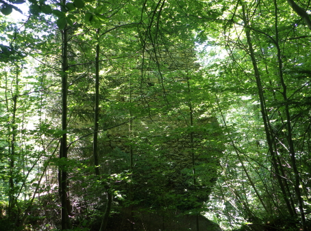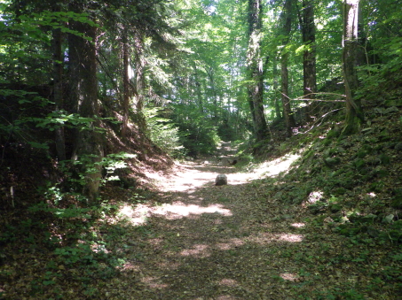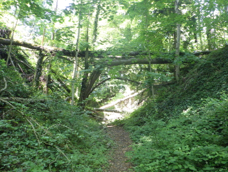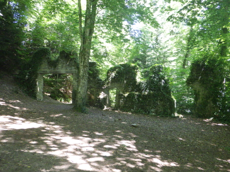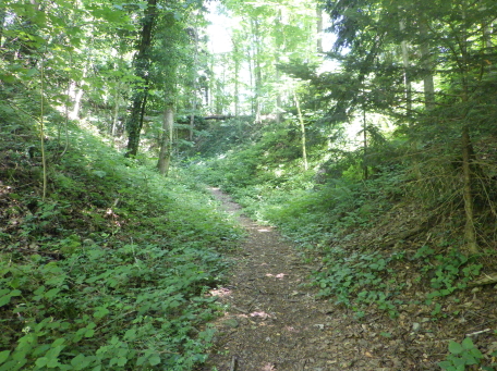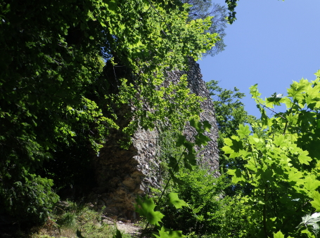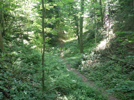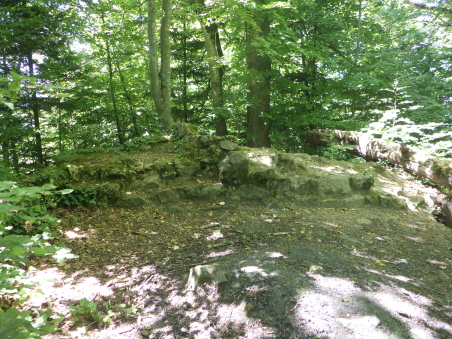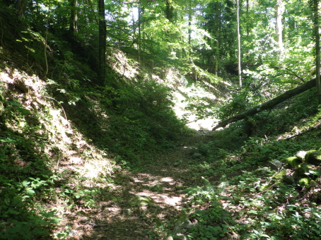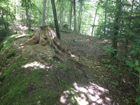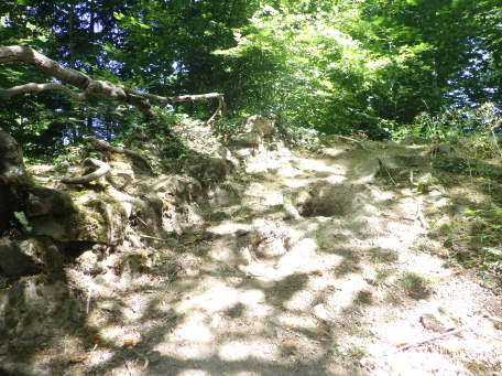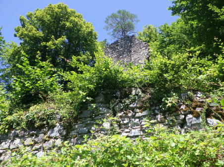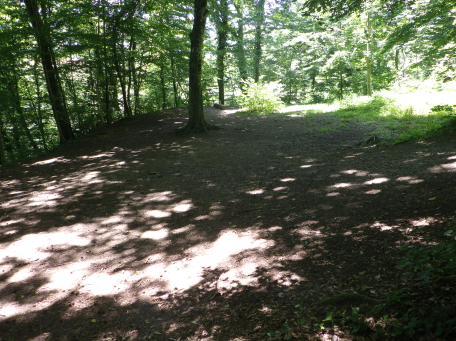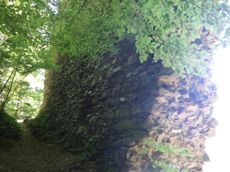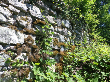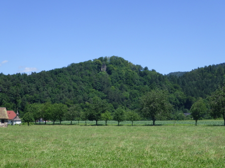 <沿革> 1079年に、ハイガーロッホ伯アーダルベルトの持ち城として史料に初めて登場する。ハイガー ロッホはヴュルテンベルク地方のホーエンツォレルン城に近く、ツォレルン家の庶流ともいわれる が確証はない。1096年以降、アーダルベルトはハイガーロッホ=ヴィースネック伯を称した。 アーダルベルトの弟ブルーノはストラスブール大聖堂の首席司祭や神聖ローマ皇帝ハインリヒ 5世の宰相を務め、ヴィースネック城はハイガーロッホと並ぶ同家の中心地として発展していたと みられている。他方で、同時期にドライザム川下流のフライブルク城を拠点に勢力を拡大する ツェーリンゲン家と競合するようになり、ヴィースネック城は1118年にツェーリンゲン公ベルトルト 3世に破壊された。1121年以降に再建されたものの、1136年時点で再び破壊された城館として 記録されている。 1160年代にハイガーロッホ=ヴィースネック家が無嗣断絶すると、遺領は同じくツォレルン家の 分家であるホーエンベルク伯が相続した。城も再び復興されたとみられるが、1293年には領地 ごとフライブルクの都市貴族ブルクハルト・トゥルナーに売却された。1318年にはシュネヴリン・ フォン・ランデック家の手に渡っている。同家はヴィースネック城から谷をさらに遡った聖メルゲン 修道院に強圧的な態度を取り、1346年に修道院長らを城に幽閉し、1355年にエープネット近郊 で殺害したとされる。、1372年にはブルーメネッガー家がヴィースネック城を取得したが、1450年 にはシュネヴリン・フォン・ランデック家が城の半分を買い戻し、1460年以降に残りも購入したと される。 1525年の農民戦争に際し、ヴィースネック城はハンス・フォン・ブルゲンバッハ率いる反乱軍に 攻め落とされたが、まもなく修復された。1577年には、アンナ・シュネヴリン・フォン・ランデックの 夫フリードリヒ・フォン・ジシッキンゲン=ホーエンブルク男爵が城を相続した。しかし、一族はフライ ブルクやエープネットに居住したため、ヴィースネック城についてはほとんど顧みられなかったと みられる。三十年戦争中の1644年にフランス軍が破壊して以降、ヴィースネック城跡の石材は 地域の建材として持ち去られた。 <手記> ヴィースネック城は1091年に築かれたフライブルク城より一回り以上歴史が古く、史料に残って いるなかでは、ブライスガウ地方最古の城館の一つといわれています。15世紀までは、貴族の 居城としてそれなりに発展していたと思われますが、今では城山の周囲には農場や集落の家々 が取り巻いているばかりです。ヒンメルライヒ駅を降りるとまもなく眼前に城山が見えてきますが、 正面には貴重な遺構である一枚城壁が屹立しており、その様子は滋賀県の三雲城の八丈岩と たいへんよく似ていると感じました。築城形態も異なる洋の東西で、既視感を覚えるというのも 不思議なものですね。 城跡へは、峰の西側先端から登山道が付いています。まず行き着くのは東側の大手曲輪で、 歯抜け状に残る城壁と城門跡があります。この大手曲輪を起点として、主郭部をぐるっとモット・ アンド・ベイリー様式の横堀が巡っています。規模の大きな薬研堀で、ここだけ切り取れば日本 の山城と言っても違和感はないでしょう。中世城郭ファンであれば、興奮すること請け合いです。 件の一枚城壁は環状城壁の一部とみられ、郭内の建物はほとんど痕跡をとどめていません。 主塔があったとみられる城内最高所には、基部とみられる石列がわずかに残り、周囲には石材 の残骸が散乱しています。その下にも土塁を伴う曲輪があり、主塔跡との間は堀切状になって いるのですが、日本の城跡のように考えるのは禁物でしょう。 |