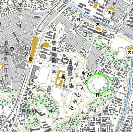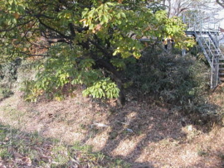 <沿革> 慶應義塾の野球場となっている丘は、古くは宮ノ台と呼ばれ、中田加賀守の城館が 営まれていたことが『新編武蔵国風土記稿』に記されている。中田氏は小机衆の1人で、 後北条氏の有力家臣であったとみられている。 矢上城西麓の谷戸にある保福寺は、加賀守の開基とされている。この谷戸には中田 氏の平時の館があったとも考えられているが、遺構は見つかっていない。城山の東麓 には、「ふえやしき」「したやしき」などの字名も残っている。 <手記> 矢上城は、矢上川が北から東を屈曲して流れる内側の、丘陵地先端の半独立丘上 にあります。川を挟んだ対岸には加瀬城があります。丘全体が野球場などの施設と なっているため、全体像の把握は困難です。 保福寺の東脇から城跡に上る石段があり、登りきった先に、中田氏の子孫が建てた という加賀守の墓碑があります。墓碑の立つあたりは、山頂から一段下がったところに あり、山側との間は堀跡にみえる溝で仕切られています。あるいは腰曲輪であったとも 考えられます。 |