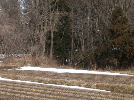 <沿革> 『蚕桑郷土誌』によれば、佐野伊勢十郎佐ェ門の館跡と紹介されているが、 詳細は不明である。 <手記> 当城は横越城の北東約1kmに位置し、町内で最も保存状況が良好といわ れているそうです。 北側を本田沢が洗い、南北を堀切で切っています。しかし、私が訪れたとき にはまだ雪が残っており、町内最良の遺構の恩恵にあずかることはできませ んでした。 |