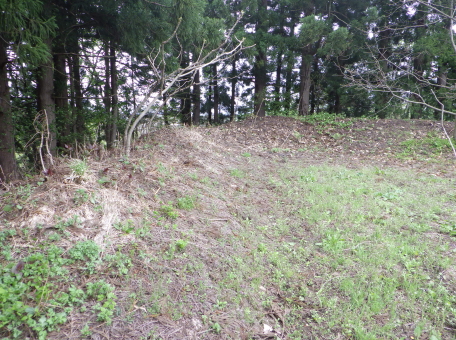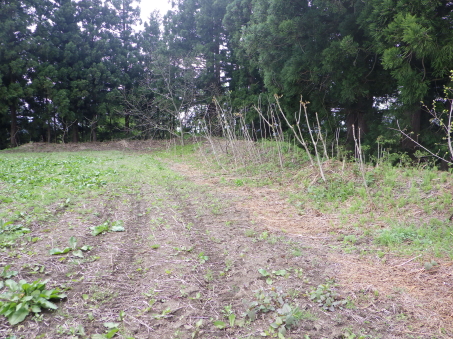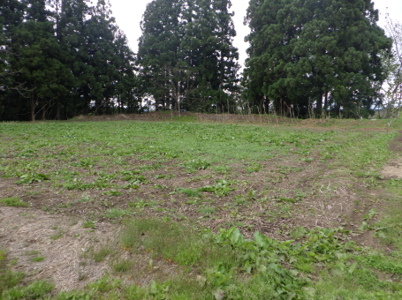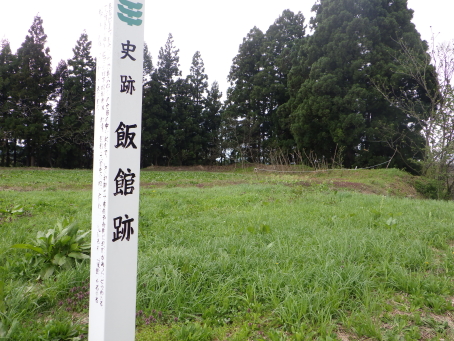 <沿革> 『奥羽永慶軍記』に、慶長五年(1600)の関ヶ原の戦いにおいて最上家臣・丹与惣左衛門が 田子内城を攻めた際、飯館・三股を案内としたとある。現地標柱ではこの記述を以て「飯館を 名乗る城館主が居住したと考えられる」としているが、軍記の表現は「飯館城主を案内とした」 と読むのが妥当と思われ、その館主の名については明らかでない。 <手記> 成瀬川左岸の段丘角地に築かれた平城です。成瀬大橋に伴う道路により城域が削られて おり、道路脇に標柱が建てられています。残った部分は畑地となっていて、北辺および西辺 には土塁の痕跡が巡っています。国土地理院地図の年代別航空写真を見ると、その南側を 東西に走る生活道路が堀跡状の細長い畑地となっていたようです。 |