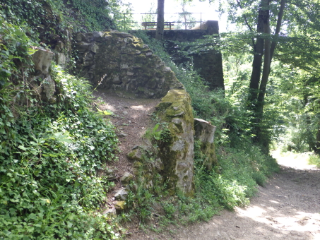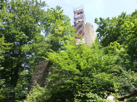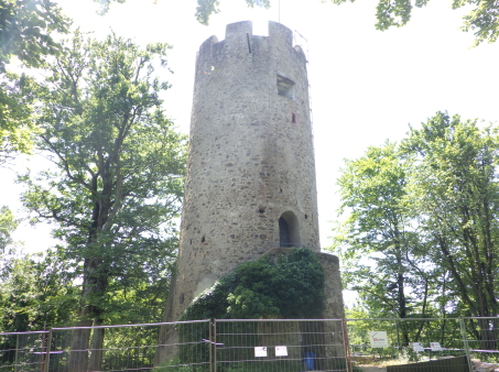 <沿革> ツェーリンゲン城の建つ城山には、4~5世紀ごろにアレマン人の高地性集落が営まれていた。 ボーデン湖畔のトゥルガウ伯であったベツェリン(ベルトルト)・フォン・フィリンゲンの子ないし孫と されるベルトルト1世は、11世紀前半にブライスガウも領してツェーリンゲン家を称した。しかし、 居城はライン河畔のリームブルク城であったとされ、ツェーリンゲンにはまだ城が築かれていな かった。シュヴァーベンの実力者であったベルトルト1世は、神聖ローマ皇帝ハインリヒ3世から シュヴァーベン大公の地位を約束されていたが、1057年のハインリヒ3世が薨去すると、未亡人 アグネス・フォン・ポワトゥーは公位と領地をルドルフ・フォン・ラインフェルデンに与えた。代わりに ケルンテン公位とヴェローナ辺境伯位を得たものの、どちらもシュヴァーベンからは離れており、 ほとんど名のみであったとされる。 ベルトルト1世の次男ベルトルト2世は1079年にルドルフの娘アグネスと結婚し、ハインリヒ3世 の子の皇帝ハインリヒ4世と対立した。ツェーリンゲン城はベルトルト2世によって築かれたとみら れているが、築城年などは明らかでない。1092年、ベルトルト2世は同じくザーリアー朝のハイン リヒ3世と対立していたヴェルフ家やローマ教皇の支持を受けて、シュヴァーベン(対立)公に選出 された。1098年、ベルトルト2世とシュタウフェン家のシュヴァーベン大公フリードリヒ1世は和議を 結び、後者を唯一のシュヴァーベン公と認める代わりに、前者はチューリッヒの所領や支配権を 得た。また、皇帝からベルトルト2世は改めて公爵に叙され、ツェーリンゲン公と号した。 この間、1091年にフライブルク城が築かれ、ベルトルト2世の子コンラート1世の代までに居城が 移されている。ツェーリンゲン城は経済的な発展が望めないうえ、帝国の権利上の制約があった とみられている一方、フライブルク城は交通の要地であり純粋な私有財産であったことが理由と 考えられている。1128年に、「apud castrum Zaringen(ツェーリンゲン城にて)」という文書が発行 されているのが、ツェーリンゲン城に関する史料上の初出とされる。 1146年、理由は不明ながらフリードリヒ1世の孫にあたるフリードリヒがツェーリンゲン城へ兵を 進め、ほとんど無抵抗で占領した。フリードリヒがフリードリヒ1世(バルバロッサ)として帝位に就く と、コンラート1世とその子ベルトルト4世は概して皇帝に忠実に振る舞い、勢力を拡張している。 しかし、1218年にベルトルト4世の子ベルトルト5世が没すると、ツェーリンゲン家の男系は断絶 した。ツェーリンゲン城は皇帝フリードリヒ2世に収公され、1246~1250年の間にフライブルク伯 コンラート1世によって占領・破壊された。その後に修築されたとみられるものの、1278年に再び フライブルク伯とフライブルク市、そして帝国の3者が争うなかで破壊された。 1281年以降になって、ツェーリンゲン城はハプスブルク家のドイツ王ルドルフ1世によって再建 されている。その後はシュピッツェンベルク伯に与えられ、1296年にフライブルク伯の手に帰した。 1327年、フライブルク伯は城をフライブルクの有力貴族であるシュネヴリン・フォン・ベルンラップ家 に売却した。1422年には、バーデン辺境伯ベルンハルト1世が城の4分の1を取得し、共同所有者 となった。ベルンハルト1世は、ツェーリンゲン家の家祖ベルトルト1世の長男で、ツェーリンゲン城 を築いたベルトルト2世の兄ヘルマン1世の後裔である。1502年には、皇帝マクシミリアン1世の 宰相コンラート・シュトゥルツェル・フォン・ブーフハイムも城の4分の1を購入した。また1507年には、 ベルンハルト1世の曽孫にあたるクリストフ1世が、さらに8分の1を買い増している。 1525年の農民戦争に際し、ツェーリンゲン城は大きな損傷を受けた。1544年のゼバスティアン・ ミュンスター著『コスモグラフィア』において、「破壊された城館」として記述されている。 クリストフ1世の7男エルンストの系統は1803年にバーデン選帝侯に昇り、1806年に神聖ローマ 帝国が解体すると大公となった。1815年のウィーン会議によって国家連合体としてのドイツ連邦 が発足すると、バーデン大公国はその主要領邦の一つとなり、廃墟となっていたツェーリンゲンの 城跡もバーデン大公の所有となった。ツェーリンゲン城は大公家の起源として一定の修復工事が 成され、今日に至っている。 <手記> ツェーリンゲン城はフライブルク旧市街の北東5km弱のところにあります。麓の集落からでも1km 以上入った山の上にあり、たしかに経済的発展性に乏しく、要害性も高いとはいえません。西麓の ブルクアッカー通り北東端から山道に入ったのですが、途中からグーグルマップのルートとはやや ずれていて、部分的に勘で直登せざるを得ませんでした。また、ルート上には竪堀状の堀底道が 長々と続いていましたが、城と関係があるのかは不明です。 城跡には円形の主塔が建っている