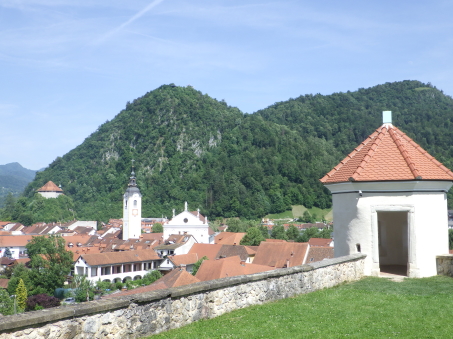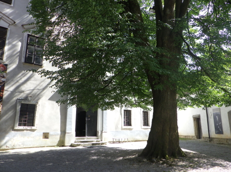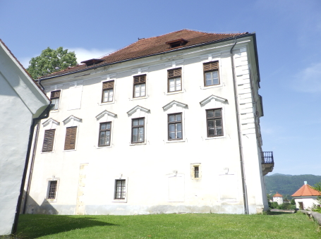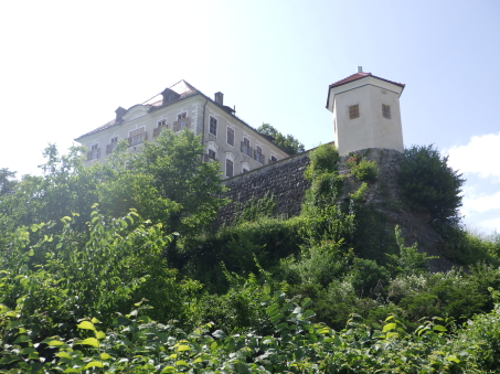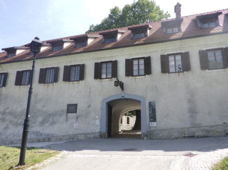 <沿革> 14世紀初頭に、ディーンガー・フォン・アペッツ家によって築かれたとされる。その後、経緯は 不明だが城は同家の手を離れて取り壊され、16世紀前半にユーリ・ランベルクによって再建 された。このときの城は正方形で2つの城塔をもち、城壁に囲まれていたとされる。 17世紀から18世紀にかけての拡張工事により、現在のバロック様式に改められた。1961年 以降は、カムニーク市の民俗博物館として運営されている。 <手記> カムニーク駅北東の丘陵角に建つ城壁に赤屋根の建物がザプリツェ城です。ザプリツェとは もともとは独立した集落を指していたようですが、今ではカムニークと同化しています。上述の 通り現在は博物館となっていて、スロベニア語オンリーのようだったので入館は断念しました。 普通に城内を歩いているだけだと気づきにくいのですが、上から見ると外郭線がきれいな 正三角形をしています。当然ながら防衛上のメリットがあるとは思えず、近世にバロック調に 改修されて以降は、つとめて宮殿として利用されていたのでしょう。城館の背後は野外博物館 となっていて、穀倉などの伝統的な建物が、あまり良い状態とはいえない感じで建っています。 |